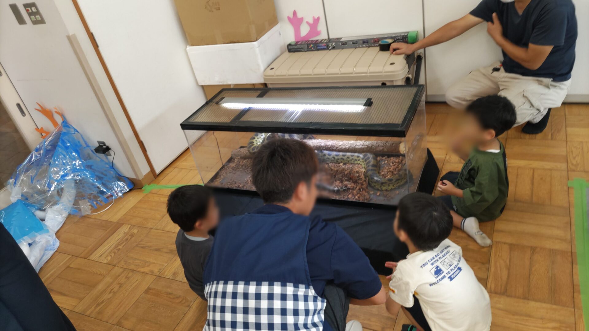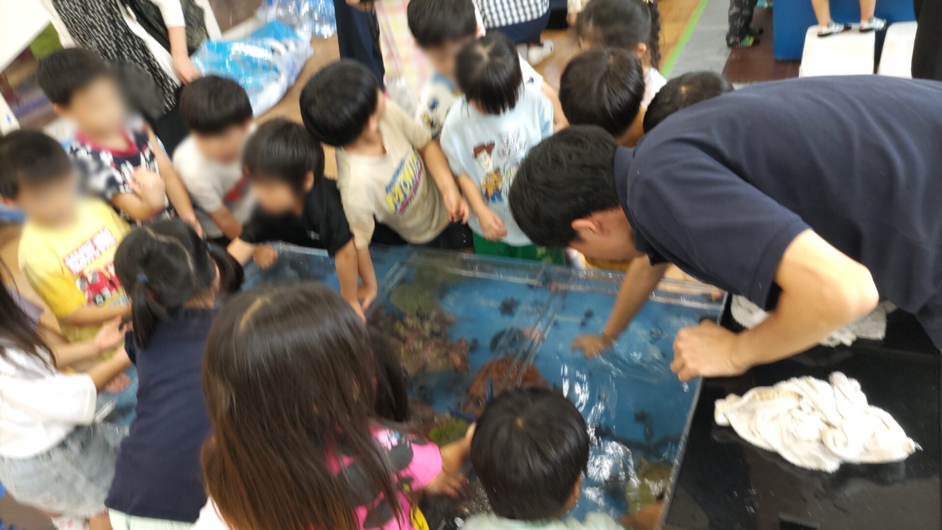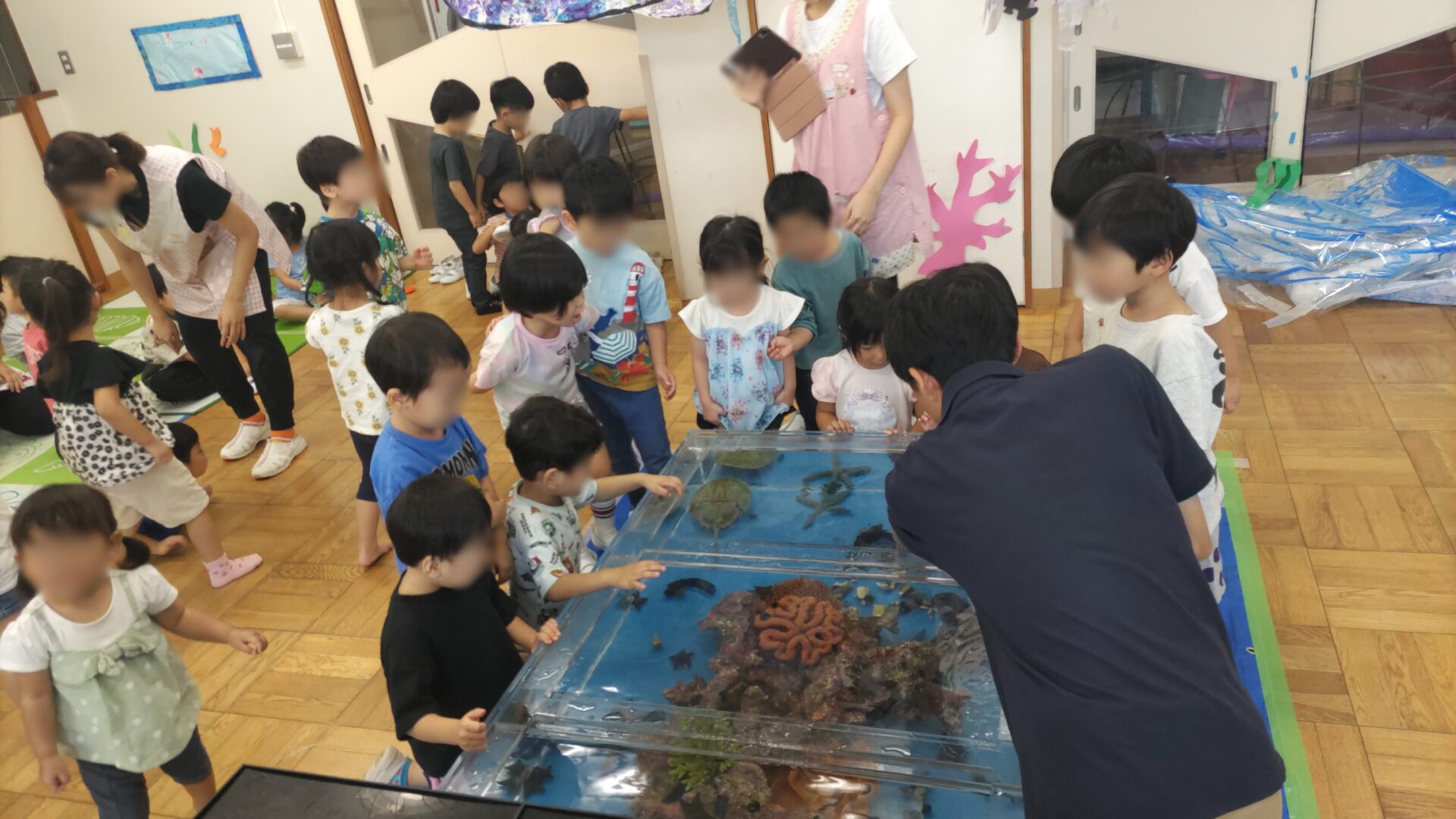 昭島市 保育園様 移動水族館 2025年9月22日 2025年9月22日、昭島市にある保育園で移動水族館を開催し、たくさんの園の子どもたちにお楽しみいただきました。今回は、「アオウミガメ」や「イエローアナコンダ」、「タッチプール」をご用意させて頂きました。 イエローアナコンダの展示では、普段見ることのない大きさに興味津々!みんな観察できたかな? アオウミガメの展示では、餌やり体験をしてもらいました。トングを使って直接ご飯をあげたりしました。 タッチプールでは、ネコザメやカブトガニ、ヒトデ、ナマコなど多くの生き物に触ってもらいました。みんな最初は怖がってたけど触れ合っているうちに仲良くなって最後には、触りたくてプールの周りがぎゅうぎゅうに!楽しんでもらえたかな? 生き物を見たり触ったりして、新たな発見や楽しさについて知ってもらい、皆様の貴重な経験になれたらなと思います。これからも笑顔溢れる移動水族館を目指し頑張りますのでよろしくお願い致します。 会場名 昭島市 保育園様 所在地 東京都 昭島市 « 小平市保育園様