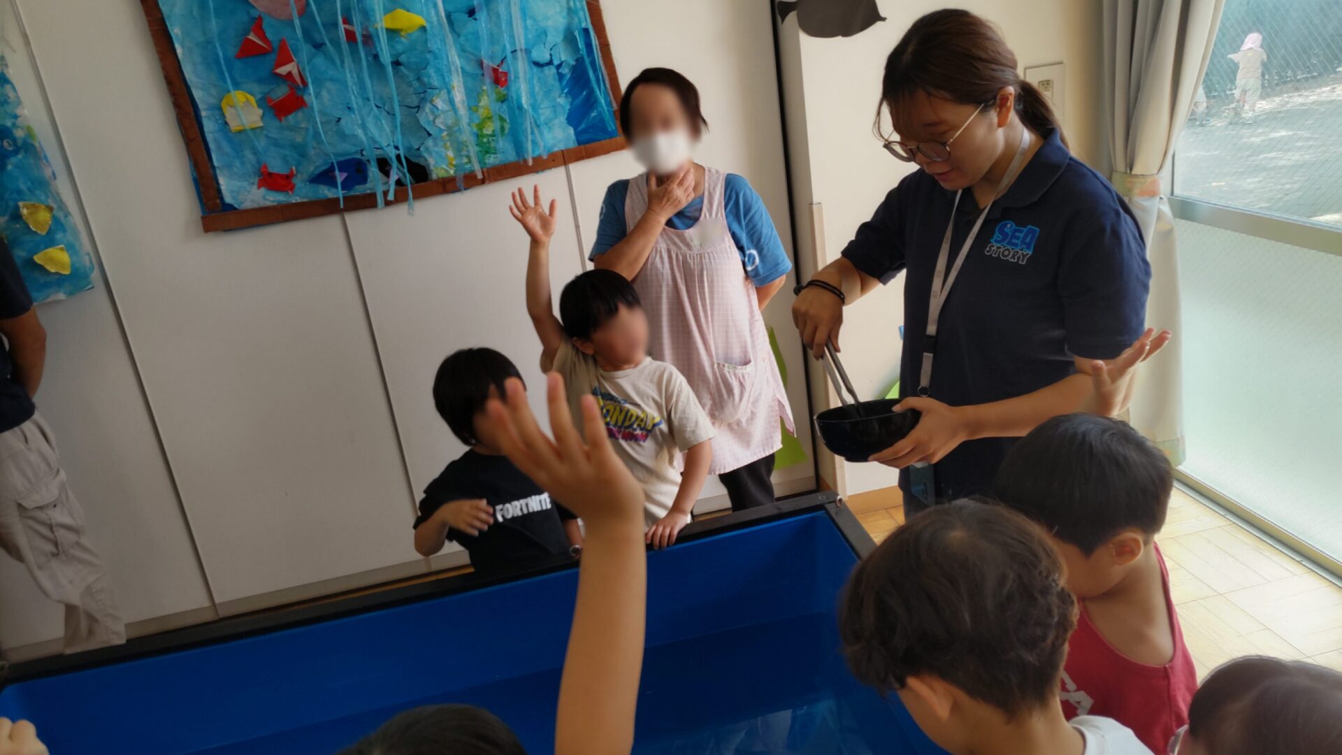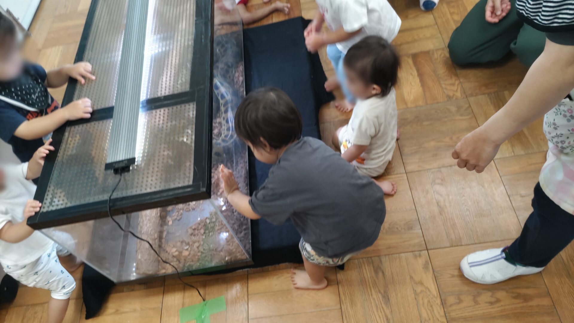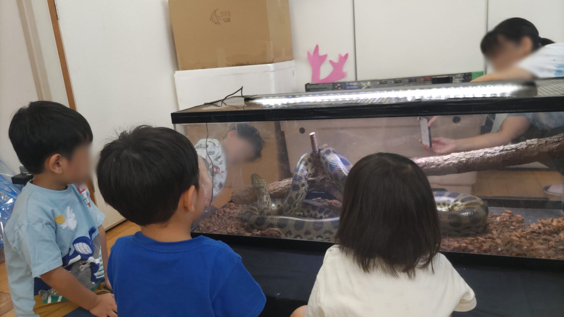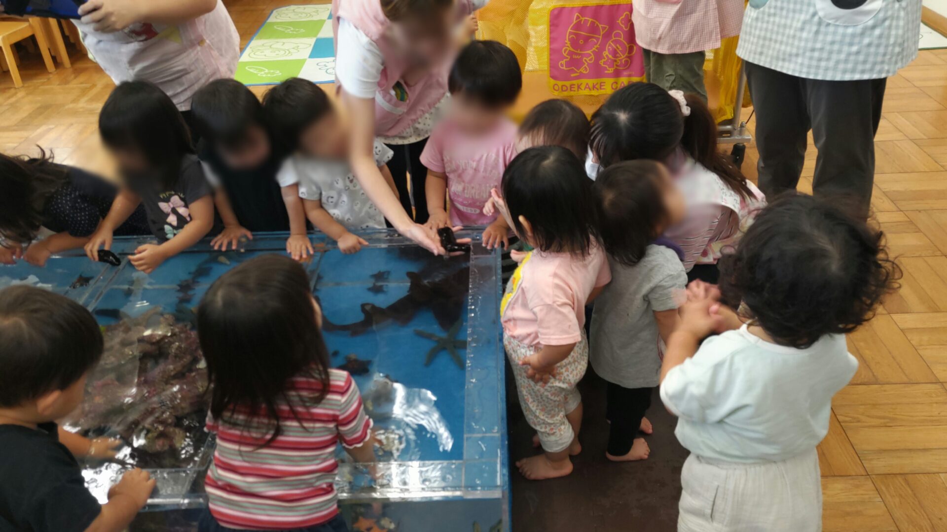 昭島市 保育園様 移動水族館 2025年9月22日 2025年9月22日、昭島市にある保育園で移動水族館を開催し、たくさんの園の子どもたちにお楽しみいただきました。今回は、「アオウミガメ」や「イエローアナコンダ」、「タッチプール」をご用意させて頂きました。 イエローアナコンダの展示では、普段見ることのない大きさに興味津々!みんな観察できたかな? アオウミガメの展示では、餌やり体験をしてもらいました。トングを使って直接ご飯をあげたりしました。 タッチプールでは、ネコザメやカブトガニ、ヒトデ、ナマコなど多くの生き物に触ってもらいました。みんな最初は怖がってたけど触れ合っているうちに仲良くなって最後には、触りたくてプールの周りがぎゅうぎゅうに!楽しんでもらえたかな? 生き物を見たり触ったりして、新たな発見や楽しさについて知ってもらい、皆様の貴重な経験になれたらなと思います。これからも笑顔溢れる移動水族館を目指し頑張りますのでよろしくお願い致します。 会場名 昭島市 保育園様 所在地 東京都 昭島市 « 小平市保育園様